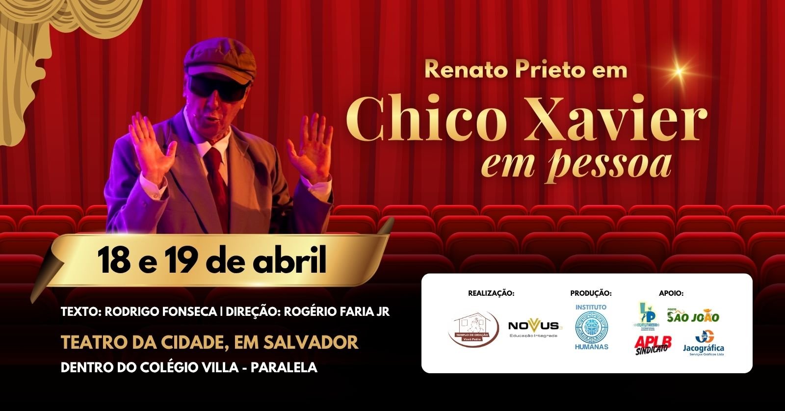 Salvador recebe espetáculo “Chico Xavier em Pessoa” com Renato Prieto nos dias 18 e 19 de abril 28 de fevereiro de 2026 Leia mais »