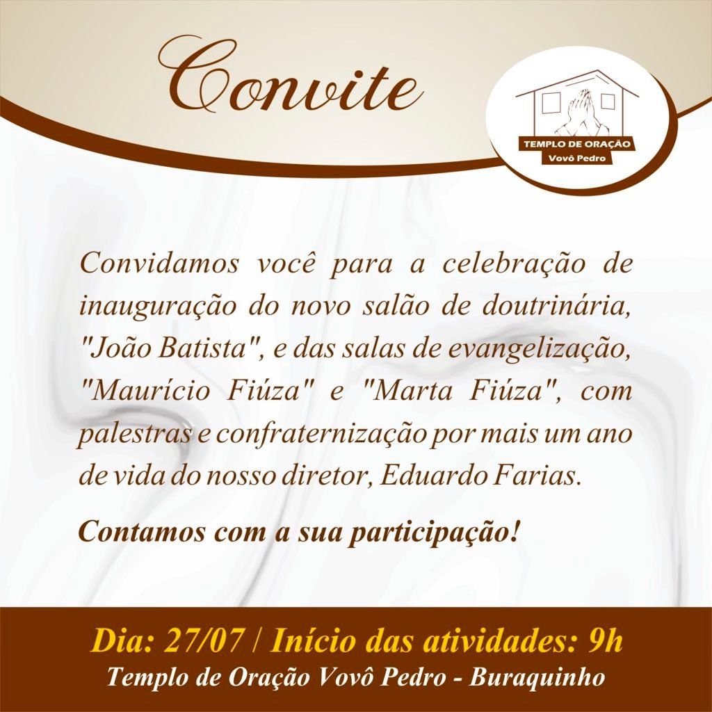 Convidamos você para a celebração de inauguração do novo salão de doutrinária, “João Batista“, e das salas de evangelização, “Maurício