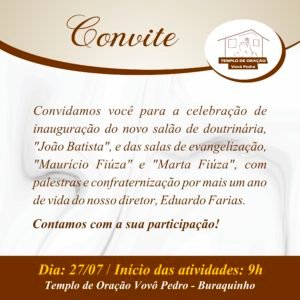 Convidamos você para a celebração de inauguração do novo salão de doutrinária, “João Batista“, e das salas de evangelização, “Maurício Fiúza” e “Marta Fiúza“, com palestras e confraternização por mais um ano de vida do nosso diretor, Eduardo Farias.