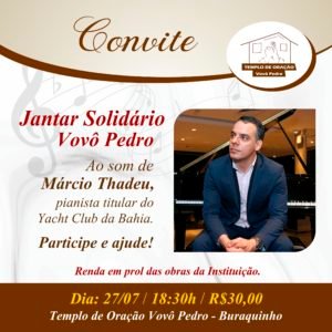 Jantar Beneficente com Marcio Thadeu, pianista titular do Yatch Club da Bahia, às 18:30h. O valor da entrada individual será R$30,00 incluso jantar e bebida (sem álcool).