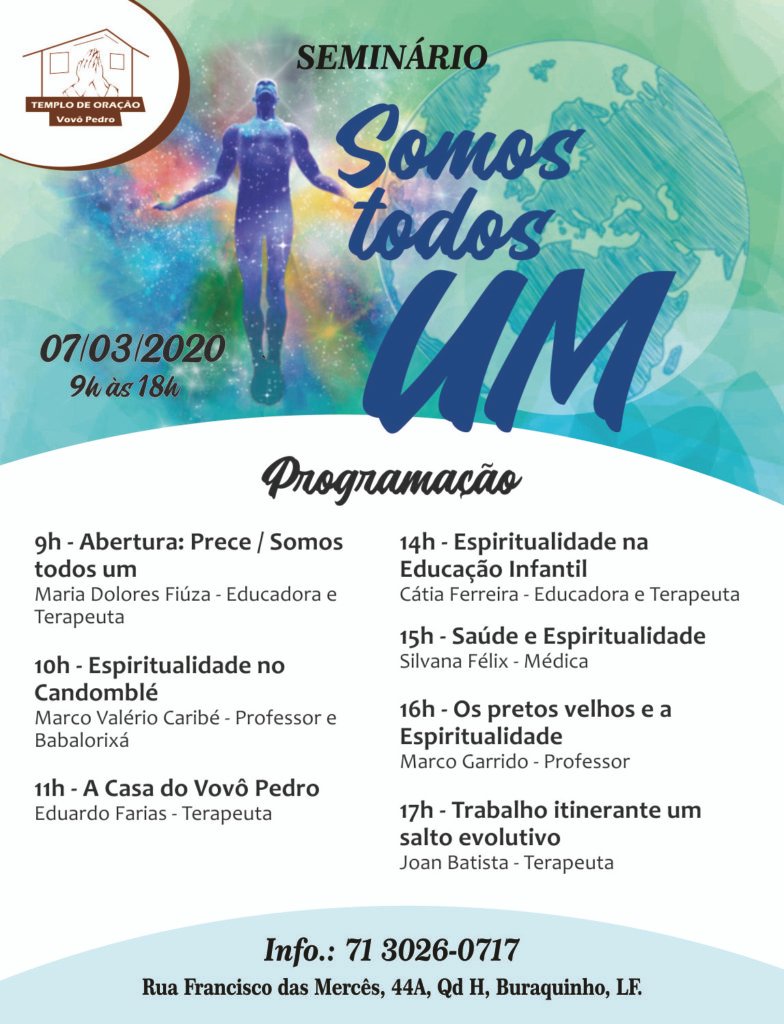 Convidamos a todos para participar do Seminário Somos Todos UM, a ser realizado no dia 07/03, sábado, das 9h às 18h, na Sede do Templo em Buraquinho, Lauro de Freitas.